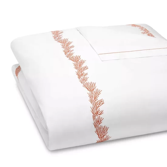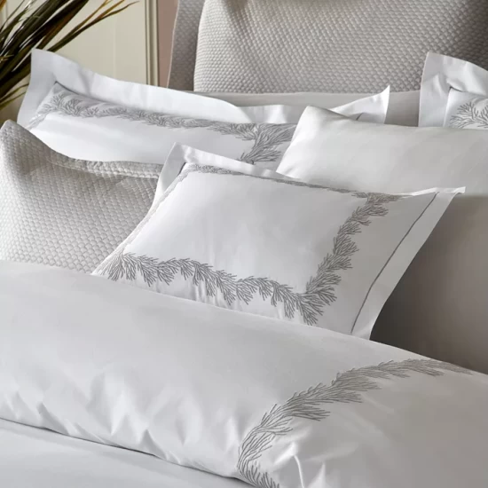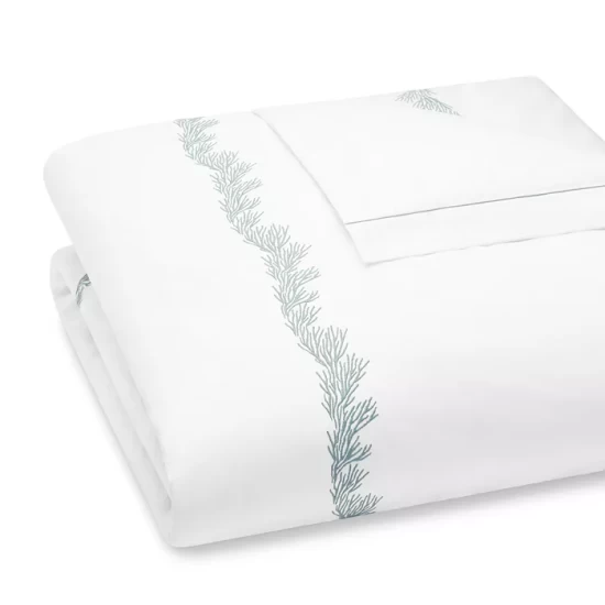 Inspired by the feathery coral found beneath the Pacific Ocean waters, Matouk’s Atoll collection is rendered in smooth 520-thread count cotton percale and finished with elegant embroidery and satin stitching.