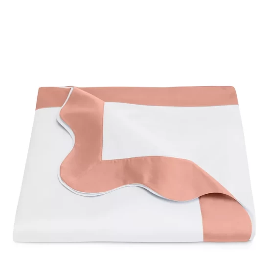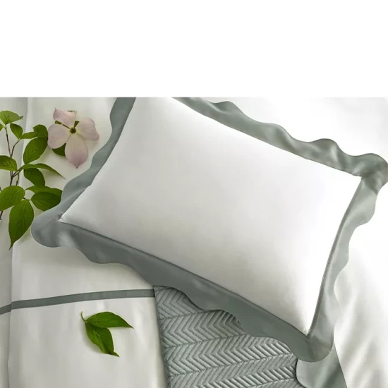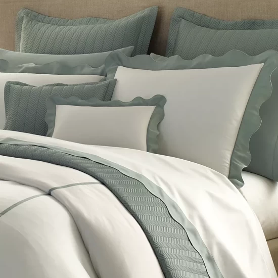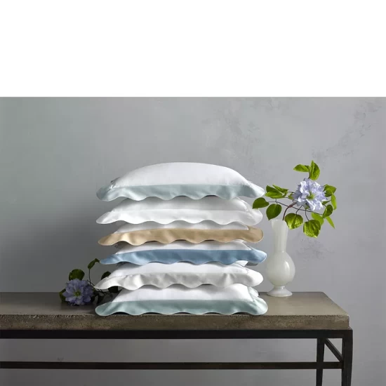 Crafted in sumptuous 615-thread count Giza Egyptian cotton sateen, the incredibly luxurious Matouk Carolina bedding collection features a contrasting border and a scallop appliqué frame. The design adds a playful feel to an elegant, classic collection.
