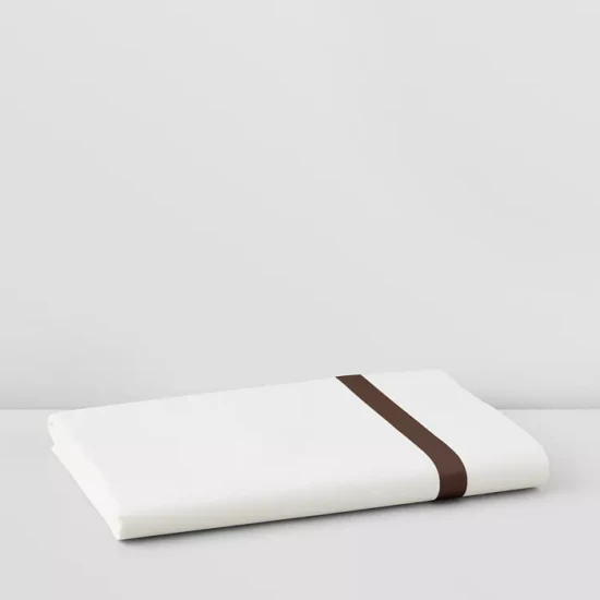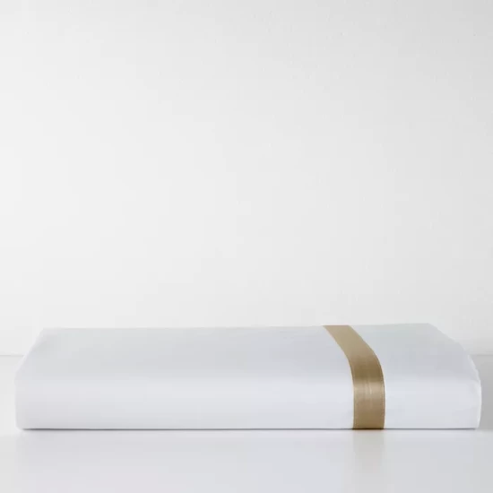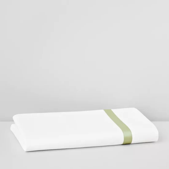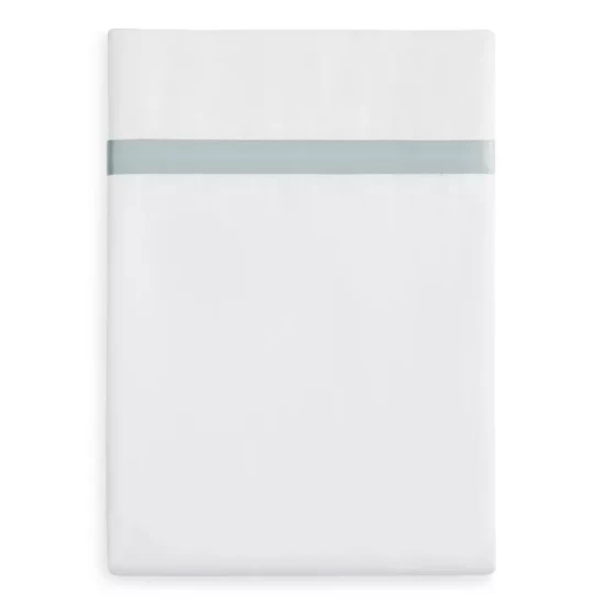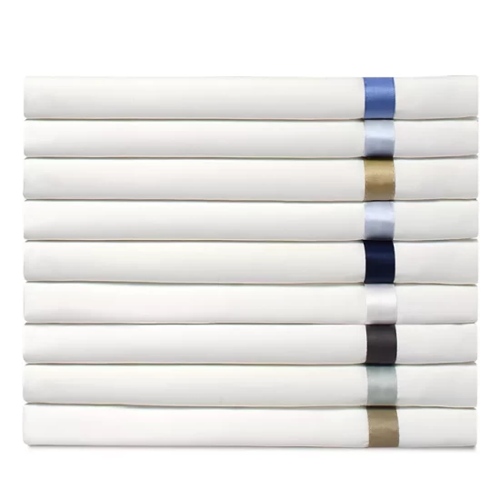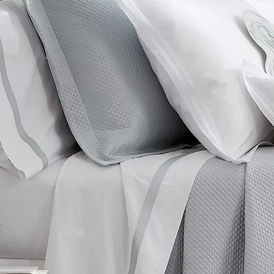 A classic bedding collection in crisp, white 600-thread count Egyptian cotton percale with a tape border in muted hues. A coordinating coverlet features an all over pearl matelasse design.