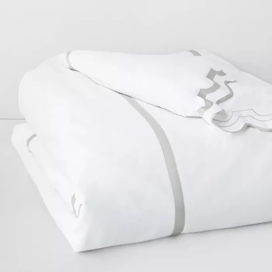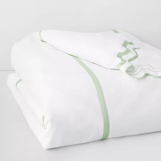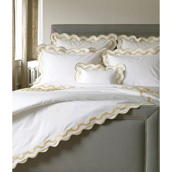 The Mirasol collection by Matouk is inspired by the unique arch trim of shop awnings on Worth Avenue in Palm Beach. A contrasting double ribbon appliqué border trims the duvet, shams and sheets crafted in crisp white, luxurious Egyptian cotton percale.