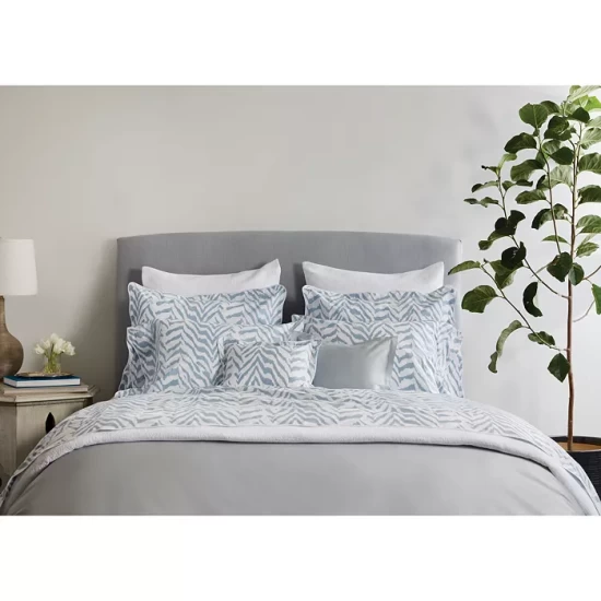 Featuring Schumacher’s as-yet-unlaunched animal print arranged in a herringbone-like pattern, Matouk Quincy bedding is printed in Italy on sumptuous 500-thread count Luca cotton percale. This unique yet surprisingly versatile collection is finished with solid taped scalloped edges.
